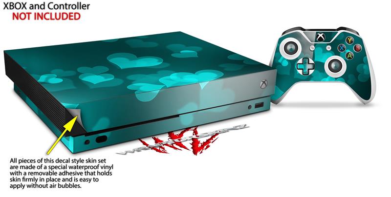 Skin Wrap for XBOX One X Console and Controller Bokeh Hearts Neon Teal