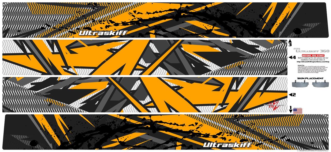 WraptorSkinz® skin wraps for Ultraskiff 360 are printed using superb photo quality designs and vibrant colors printed with special fade resistant inks that last even in direct sun for years. WraptorSkinz® are a composite of two layers of commercial grade materials. The bottom layer is a soft, flexible material with a special ultra-sticky adhesive designed to adhere to plastic body of the Ultraskiff. Next we print the bottom layer with UV protected, fade resistant inks that deliver superb photo quality designs in vibrant colors. Finally we bond a professional grade laminate over the entire skin adding a glossy protective finish.