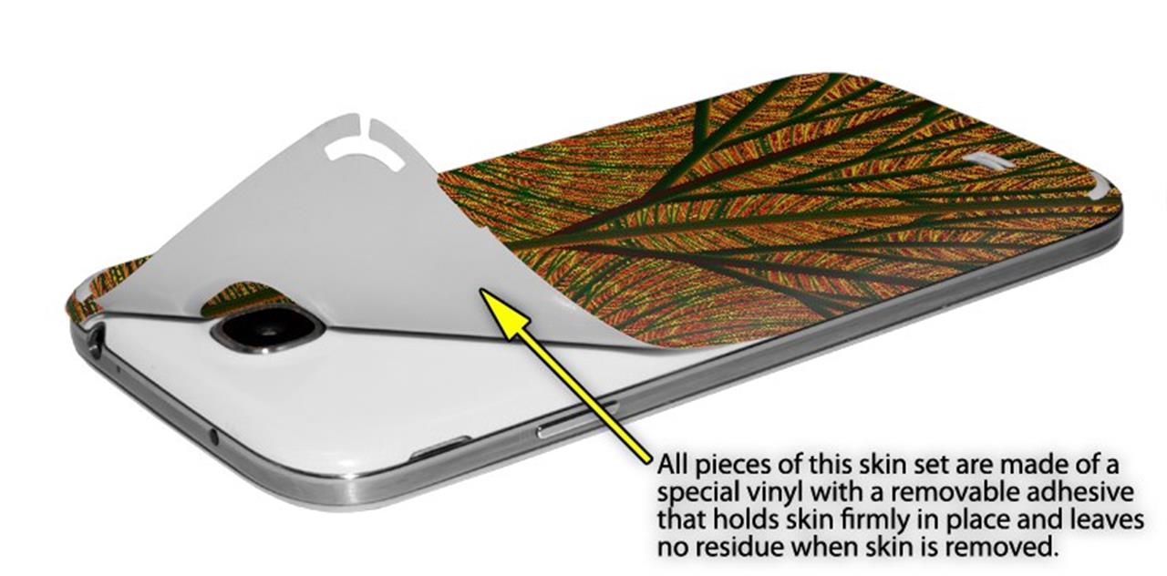 • Decal style vinyl skin covers front and back of Samsung Galaxy S4 phone.