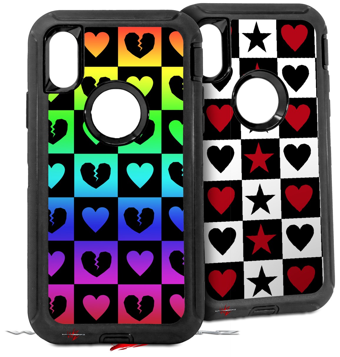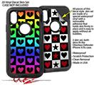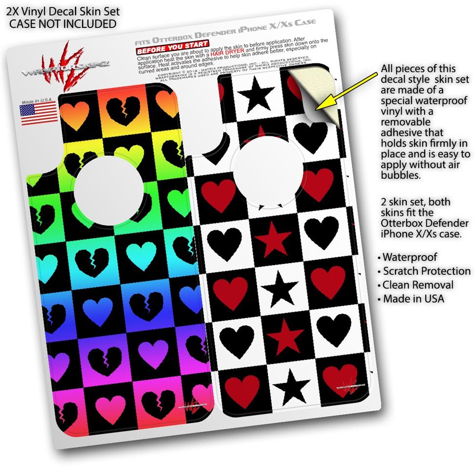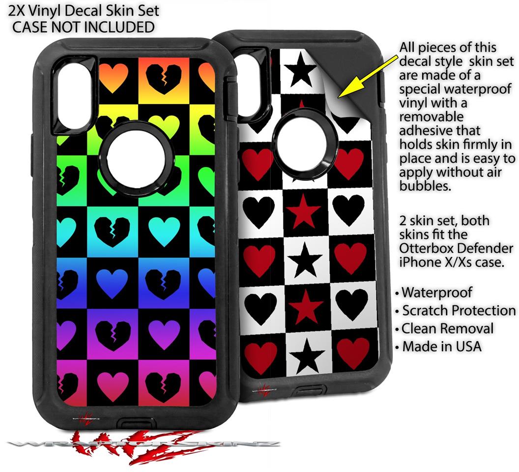 2x Decal style Skin Wrap Set compatible with Otterbox Defender iPhone X and Xs Case - Love Heart Checkers Rainbow (CASE NOT INCLUDED)