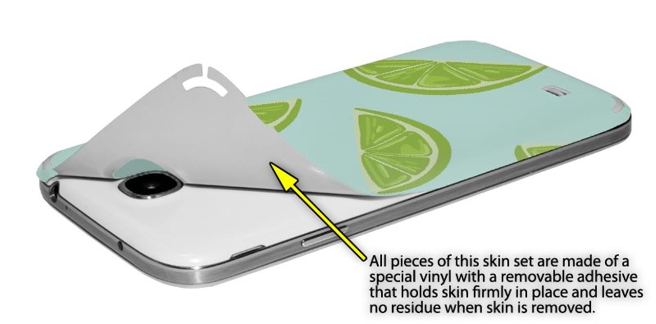 • Decal style vinyl skin covers front and back of Samsung Galaxy S4 phone.