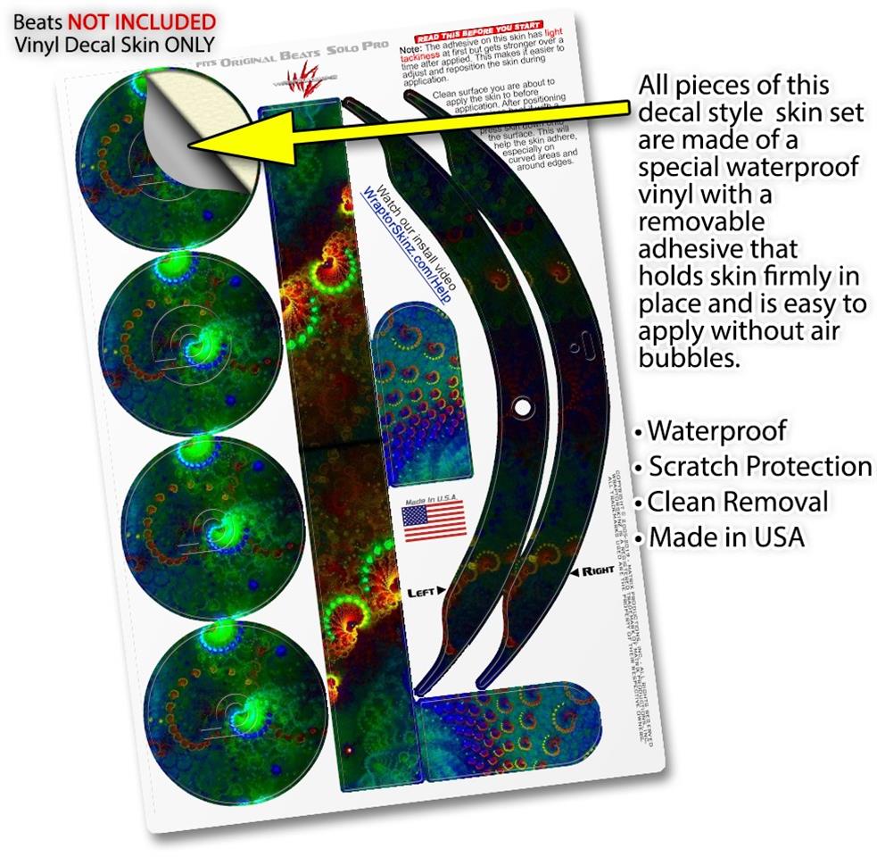 This product is in no way affiliated with or endorsed by Apple or Beats brand products. WraptorSkinz® skin wraps work with the Original Beats Solo Pro version 1 headphones. Printed using superb photo quality designs and vibrant colors printed with special fade resistant inks that last even in direct sun for years. WraptorSkinz are a composite of two layers of commercial grade materials. The bottom layer is a soft, flexible vinyl with a special removable adhesive that is easily positioned, applied without air bubbles. Next, we print the bottom layer with UV protected, fade resistant inks that deliver superb photo quality designs in vibrant colors. Finally, we bond a professional grade laminate over the entire skin adding a glossy protective finish.