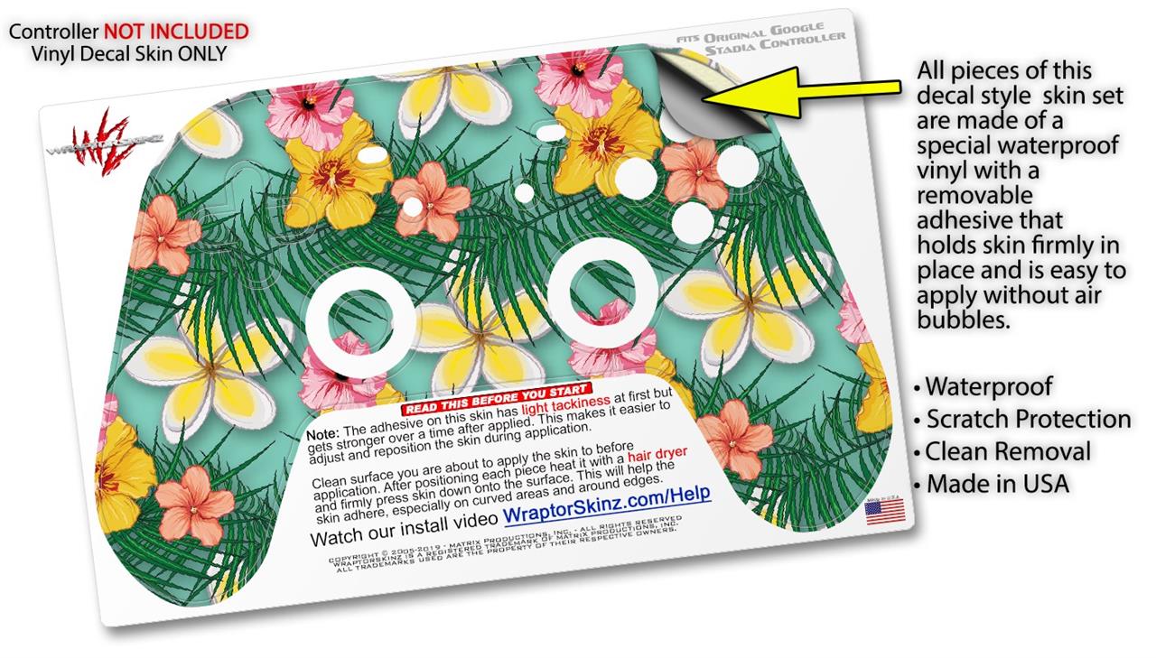 This product is in no way affiliated with or endorsed by Google. WraptorSkinz® skin wraps work with the Original Google Stadia version 1 Controller. Printed using superb photo quality designs and vibrant colors printed with special fade resistant inks that last even in direct sun for years. WraptorSkinz are a composite of two layers of commercial grade materials. The bottom layer is a soft, flexible vinyl with a special removable adhesive that is easily positioned, applied without air bubbles. Next, we print the bottom layer with UV protected, fade resistant inks that deliver superb photo quality designs in vibrant colors. Finally, we bond a professional grade laminate over the entire skin adding a glossy protective finish.