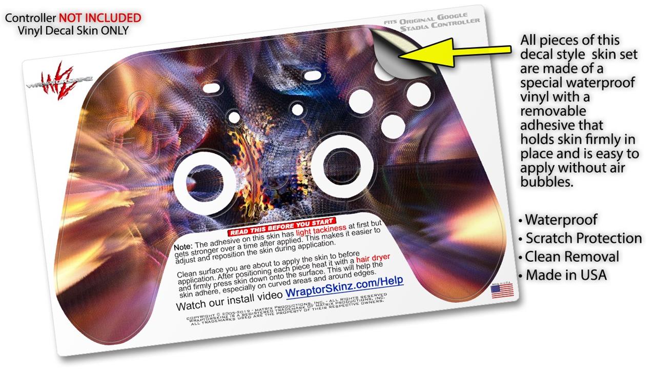 This product is in no way affiliated with or endorsed by Google. WraptorSkinz® skin wraps work with the Original Google Stadia version 1 Controller. Printed using superb photo quality designs and vibrant colors printed with special fade resistant inks that last even in direct sun for years. WraptorSkinz are a composite of two layers of commercial grade materials. The bottom layer is a soft, flexible vinyl with a special removable adhesive that is easily positioned, applied without air bubbles. Next, we print the bottom layer with UV protected, fade resistant inks that deliver superb photo quality designs in vibrant colors. Finally, we bond a professional grade laminate over the entire skin adding a glossy protective finish.