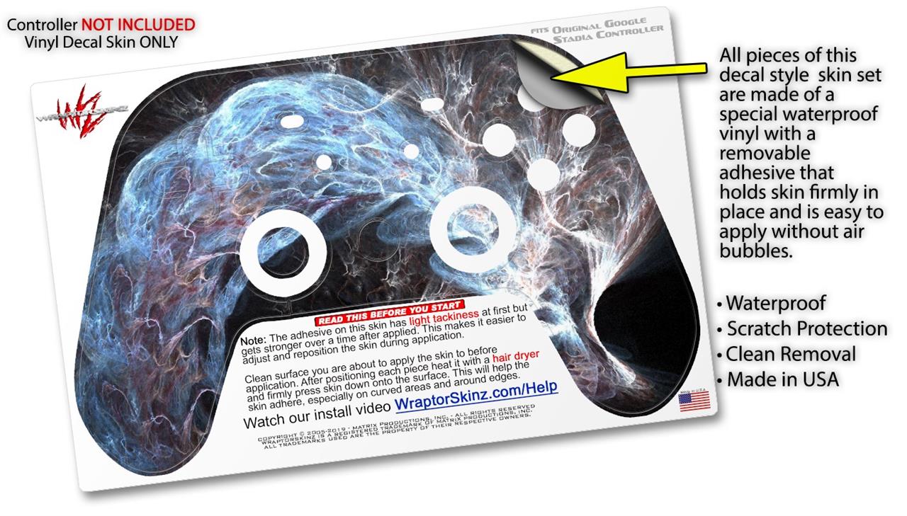 This product is in no way affiliated with or endorsed by Google. WraptorSkinz® skin wraps work with the Original Google Stadia version 1 Controller. Printed using superb photo quality designs and vibrant colors printed with special fade resistant inks that last even in direct sun for years. WraptorSkinz are a composite of two layers of commercial grade materials. The bottom layer is a soft, flexible vinyl with a special removable adhesive that is easily positioned, applied without air bubbles. Next, we print the bottom layer with UV protected, fade resistant inks that deliver superb photo quality designs in vibrant colors. Finally, we bond a professional grade laminate over the entire skin adding a glossy protective finish.