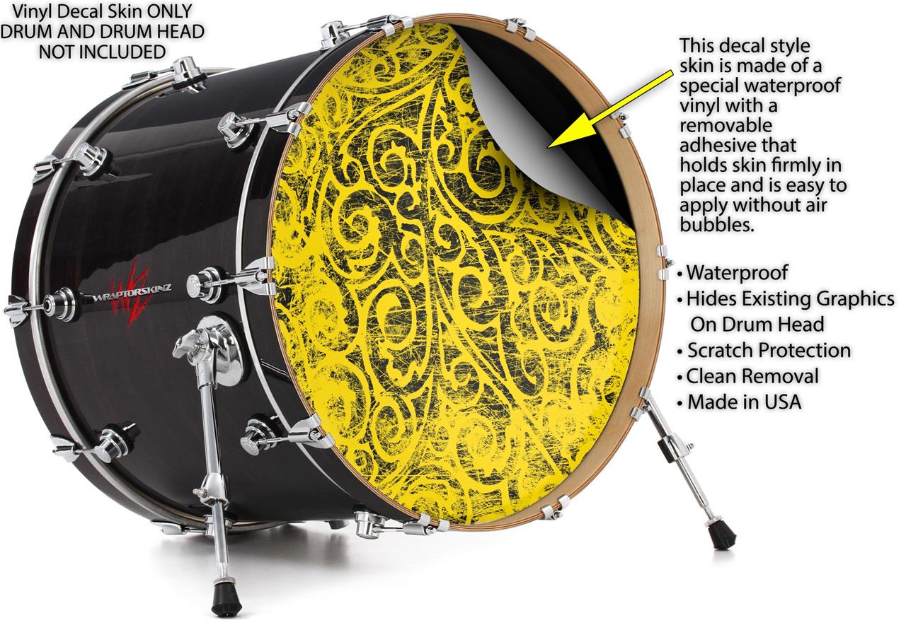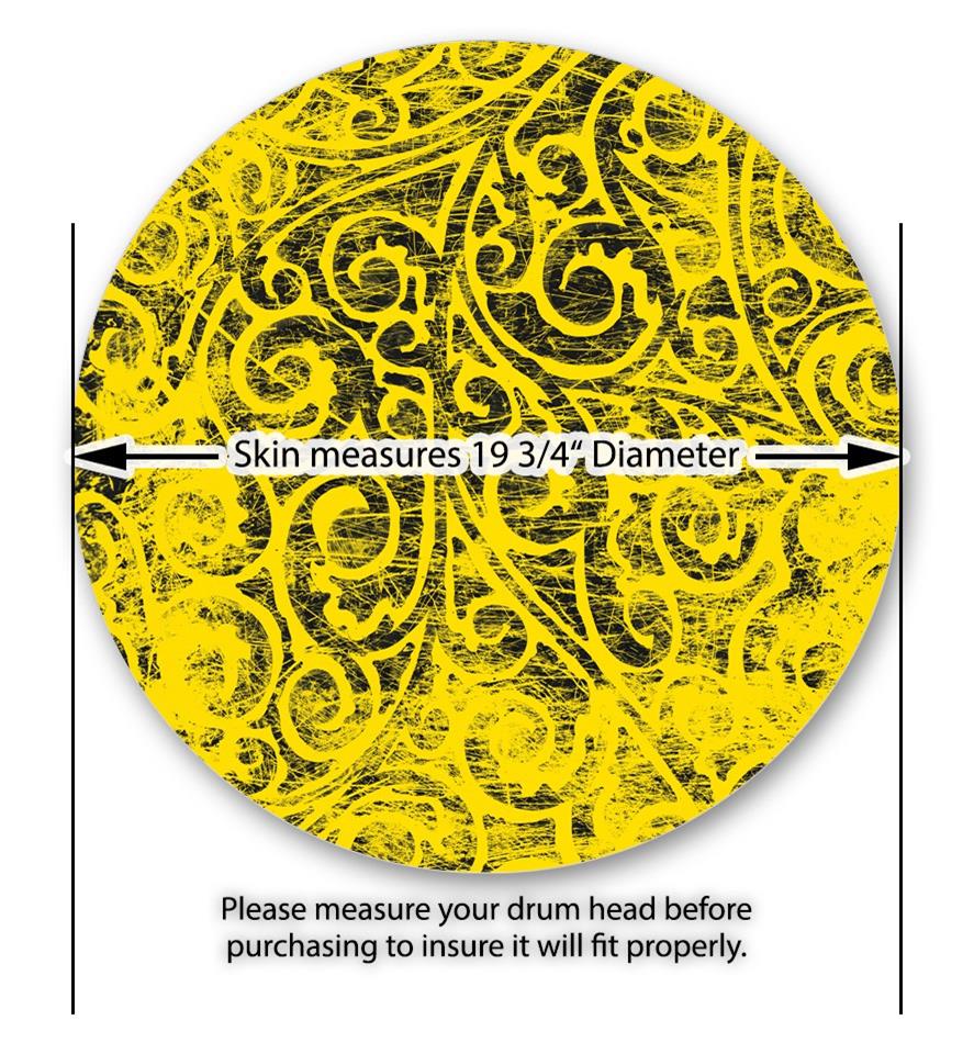 This design also available in other sizes. WraptorSkinz® skin wraps compatible with most kick drum heads. Printed using superb photo quality designs and vibrant colors printed with special fade resistant inks that last even in direct sun for years. WraptorSkinz are a composite three layer commercial grade materials vinyl. The bottom layer is a air release, grey block out removable adhesive that hides existing graphics on the drum head and is easily applied without air bubbles. The middle layer is a flexible vinyl printed with UV protected, fade resistant inks that deliver superb photo quality designs in vibrant colors. Finally, we bond a professional grade laminate over the entire skin adding a glossy protective finish.