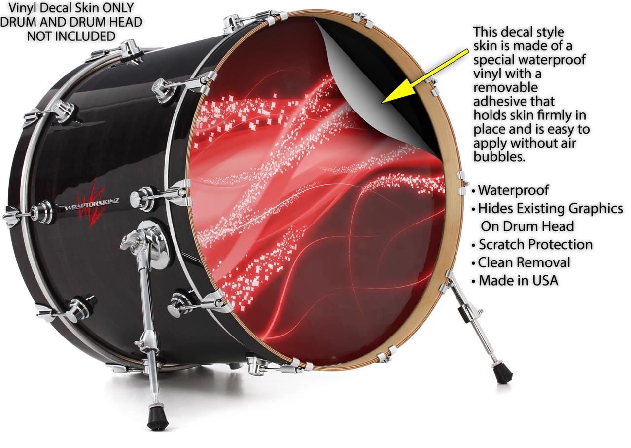This design also available in other sizes. WraptorSkinz® skin wraps compatible with most kick drum heads. Printed using superb photo quality designs and vibrant colors printed with special fade resistant inks that last even in direct sun for years. WraptorSkinz are a composite three layer commercial grade materials vinyl. The bottom layer is a air release, grey block out removable adhesive that hides existing graphics on the drum head and is easily applied without air bubbles. The middle layer is a flexible vinyl printed with UV protected, fade resistant inks that deliver superb photo quality designs in vibrant colors. Finally, we bond a professional grade laminate over the entire skin adding a glossy protective finish.