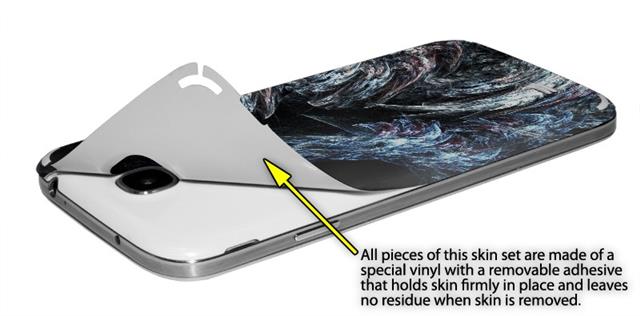 • Decal style vinyl skin covers front and back of Samsung Galaxy S4 phone.