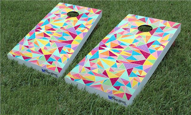 WraptorSkinz corn hole wraps stick to Painted surfaces and even Raw Wood! Automotive vinyl does not cut it on bag toss game boards. We use professional grade, 7 year vinyl with specially formulated adhesive that can be applied directly to raw wood boards. Then we print with the UV protected inks for bright, vivid colors that resist sun fading.