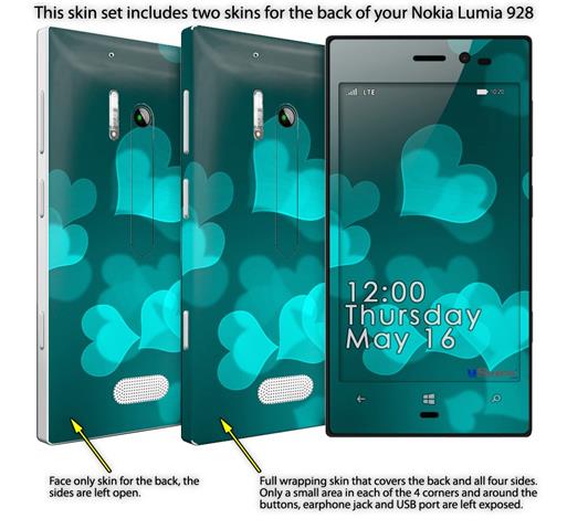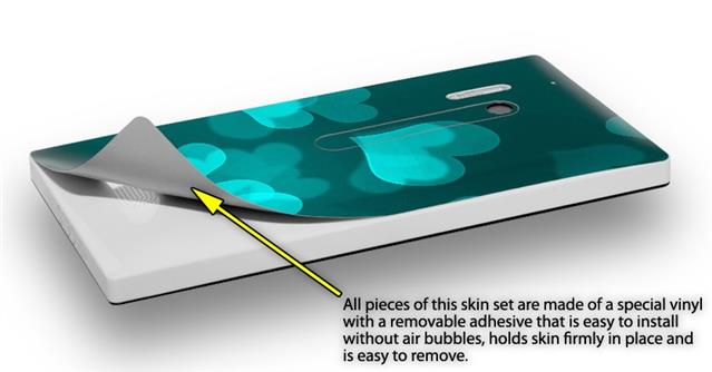 • Decal style vinyl skin covers front, back and side of Nokia Lumia 928 phone.