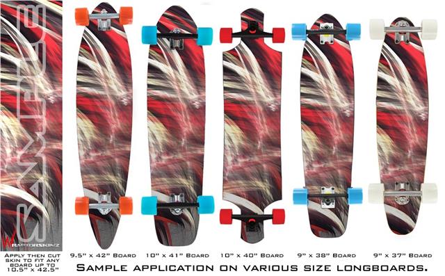 Our longboard skins are made so that one size fits boards up to 10” wide x 42” long. This means after applying the skin it you will trimming to fit you’re the shape of your board with a sharp utility knife.